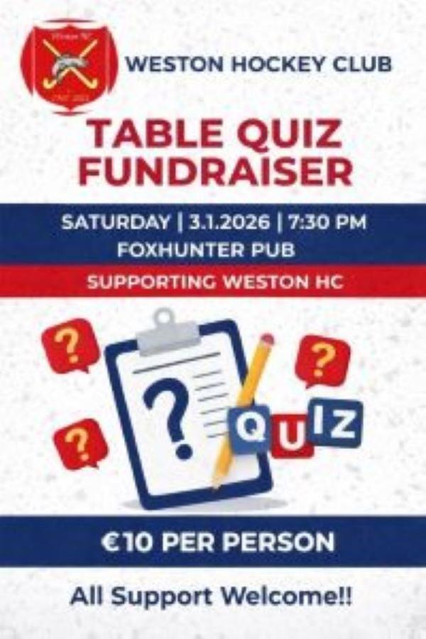 Weston Hockey Club is inviting players, teams, friends, families and supporters to a Trivia Table Quiz Night on Saturday 3 January 2026. It promises to be a fun night of friendly competition with lots of laughs and will include a raffle with great prizes up for grabs. This is the first scheduled fundraising event for the club for 2026 with all proceeds being returned to continue to develop facilities and activities at Weston Hockey Club. The quiz will be hosted at the Foxhunter Pub, Ballydowd, Lucan. Arrive from 7pm for a 7.30pm start.